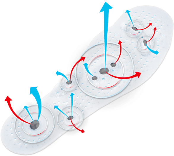 A medida que el pie entra en contacto con la plantilla, los receptores presionan las proyecciones magnéticas del pie. De esta manera, comienzan la acción del campo magnético. Las terminaciones nerviosas dentro del pie, estimuladas por un masaje automático de este tipo, estimulan a todo el cuerpo a regenerarse y deshacerse de la tensión y el estrés innecesarios, y en su lugar agregan energía.